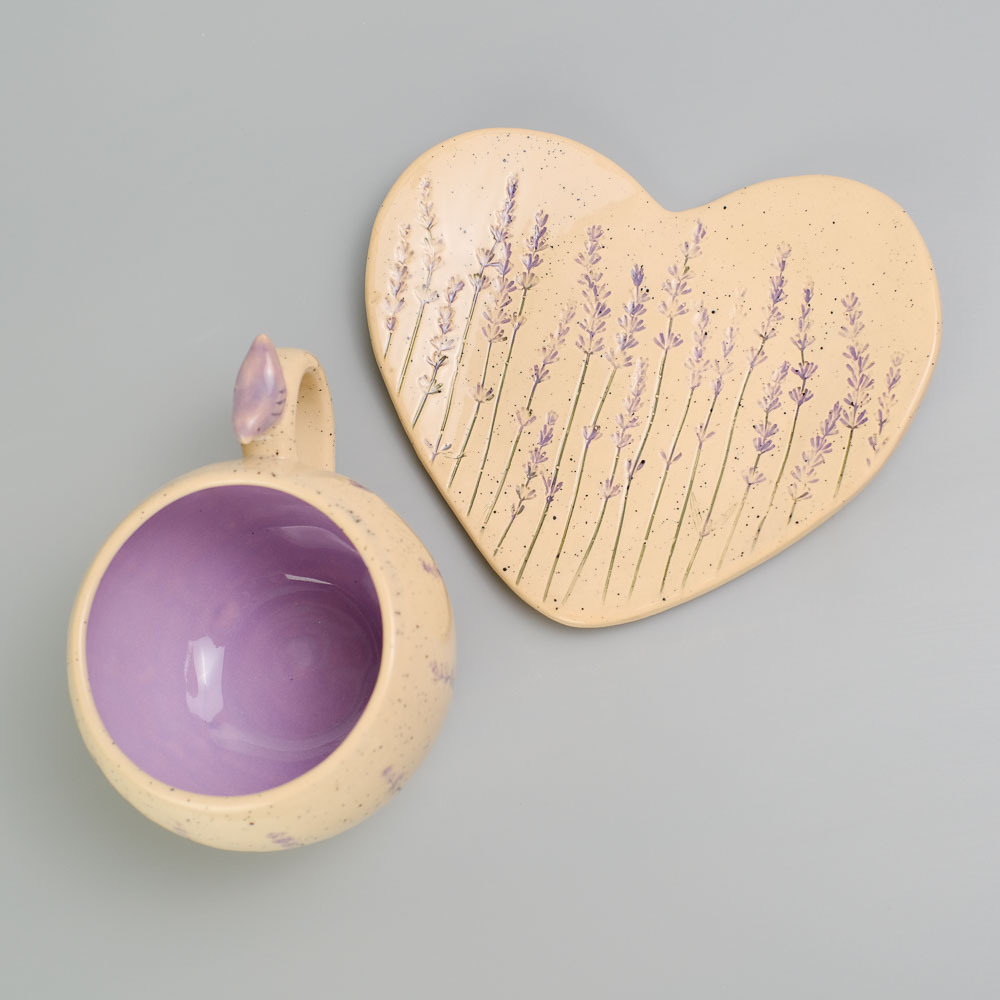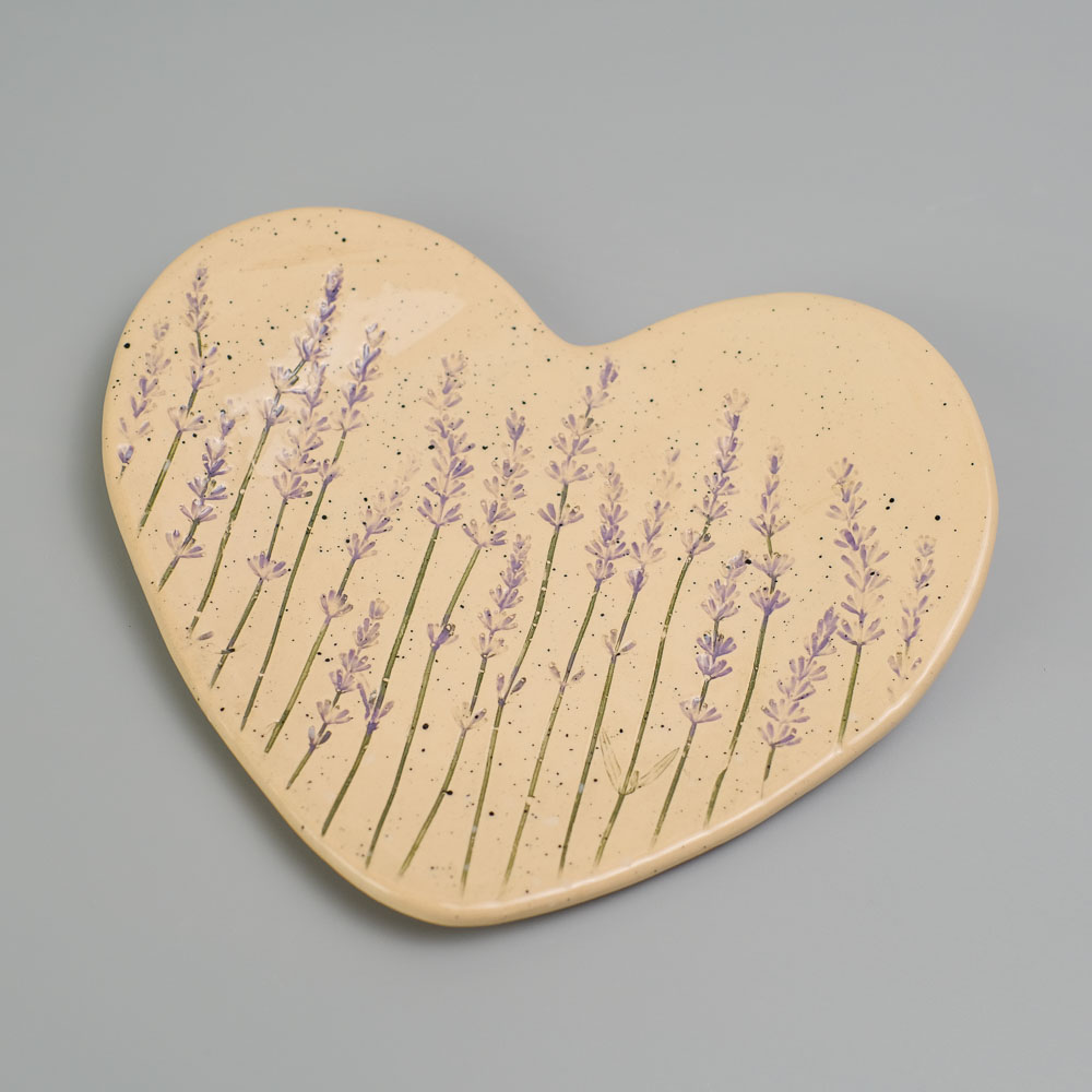 Керамічне блюдце у формі серця з відбитками справжньої лаванди.